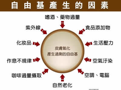 自由基,係氧在體內新陳代謝後所產生的物質,它的活性極 強,可與任何物質發生強烈的反應。在正常生理情況下,如 遇細菌、黴菌、病毒或異物等侵入時,體內的防禦系統會通 知吞噬細胞準備應戰,於是吞噬細胞經由相關酵素的催化, 產生超氧陰離子自由基,以清除細菌或受感染細胞;換言之 ,體內必須具備一定量的自由基作為預防、抵禦疾病的武器 。若受到異常環境的影響,例如輻射線或紫外線、抽煙、農 藥、空氣物等、甚至心理壓力、生活不正常、熬夜焦慮也會 產生自由基。