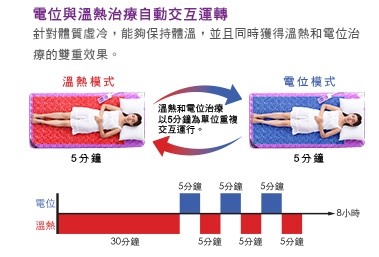 給予人體電場,改變體內正、負離子之分佈情形,產生維持身體內部平衡的功能。負電位能有效放鬆身體,促進深層睡眠。