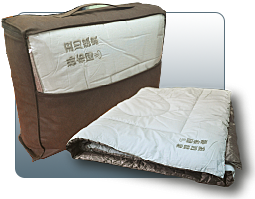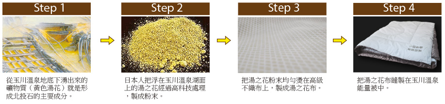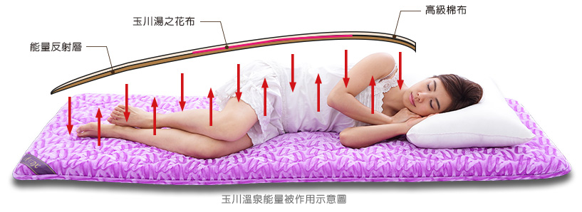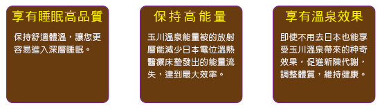 日本將玉川湯之花(珍貴罕見的稀有礦石—北投石的主要構成物質)粉末經奈米高科技融入不織布形成特殊的湯之花布,再以高級棉布與特製能量反射層縫製而成玉川溫泉能量被,能保持體溫,促進新成代謝,幫助入眠。