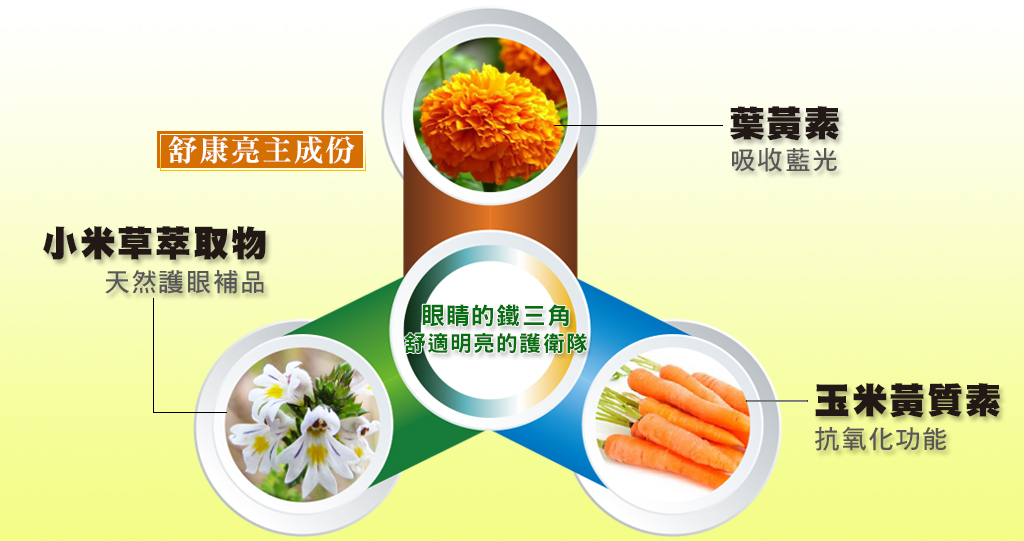 葉黃素,可吸收藍光,提高敏感度與幫助夜晚清晰;搭配玉米黃素質素,有助於對老年人眼的保養調整。對常見的各種問題、不適,也有助益。市面上葉黃素分成兩類,都是由金盞花萃取而來的。