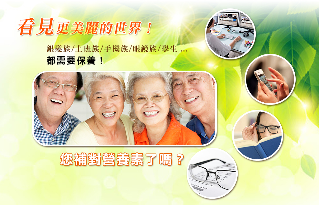 .注重視力日常保健者 .銀髮族:年長者的保養 .3C族:3C產品,手機、電腦經常使用者 .上班族:長時間接觸螢幕藍光 .用眼族:經常閱讀、看電視者